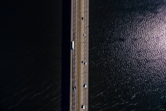 Aerial top view of bridge road automobile traffic of many cars, transportation concept. Drone photo