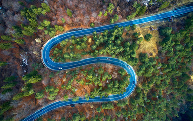The aerial view of winding road from high mountain pass with trees in Transylvania, Romania, Curved road view by drone in the autumn-winter time