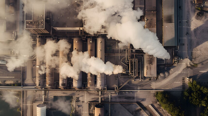 Areal view of factory. Smoke from industrial chimney. Urban landscape drone photo