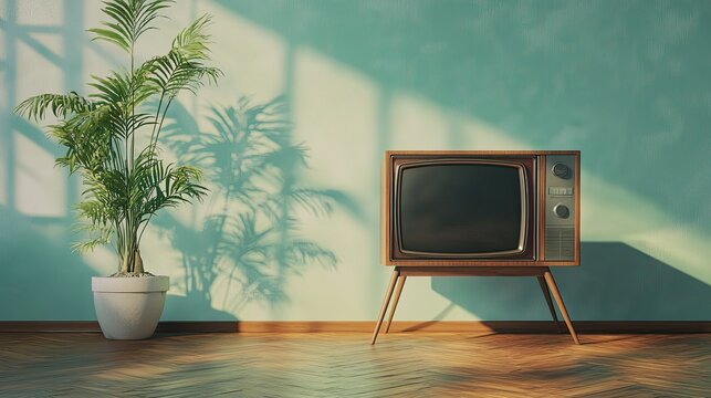 Nostalgic composition featuring a vintage television set and indoor areca palm