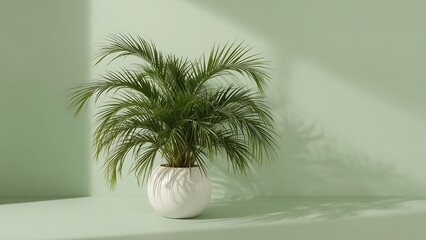 Indoor areca palm plant in white pot against green wall with shadow, adding a touch of nature and freshness to the home decor, minimal style
