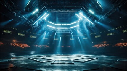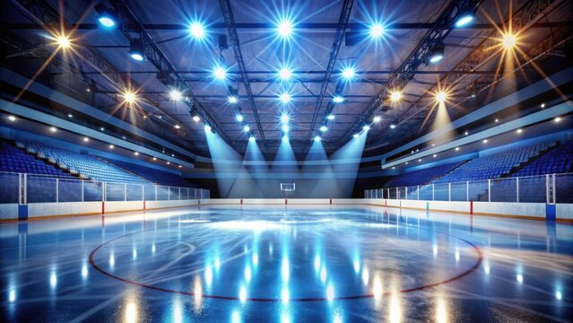 Stadium with illuminating floodlights and reflective wet track under open sky