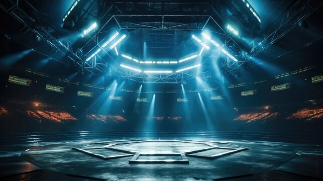 Shouting shirtless fighter roaring in stadium with cyan glitch and sweat-soaked intensity