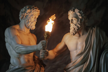 One of the titans Prometheus gave fire to humanity. Marble statue. Ancient Greek and Roman mythology.