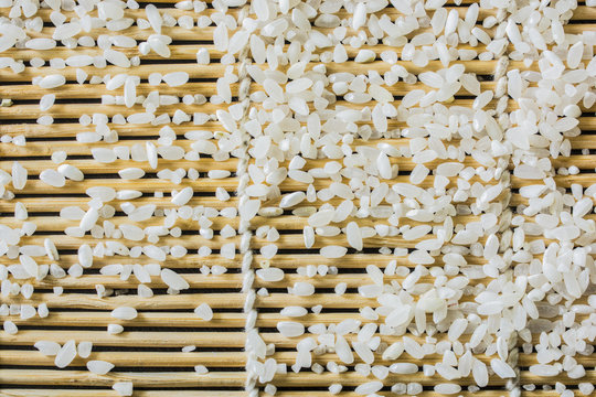 the rice is scattered on a sushi mat