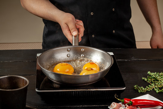 Peaches on a fry pan. Canned fruit yellow peaches, black wooden background, board.
