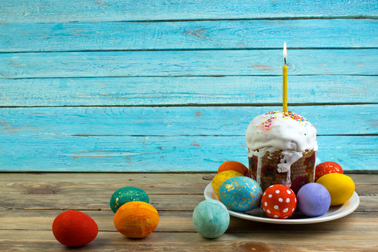 Happy Easter card. Colorful shiny easter eggs cake with white icing and sugar decor on the table decorated in rustic style. Copy space for text.