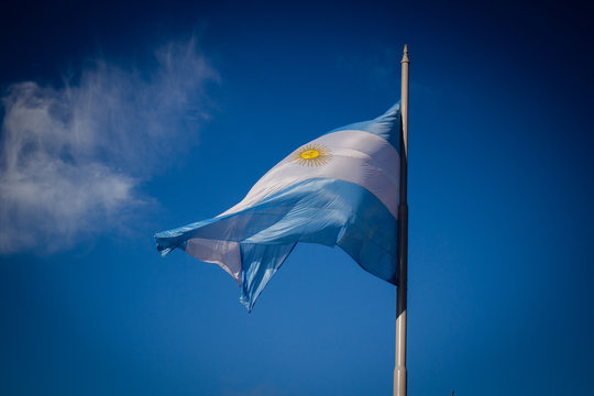 Argentine flag flying on a flagpole on a sunny day with clear skies
