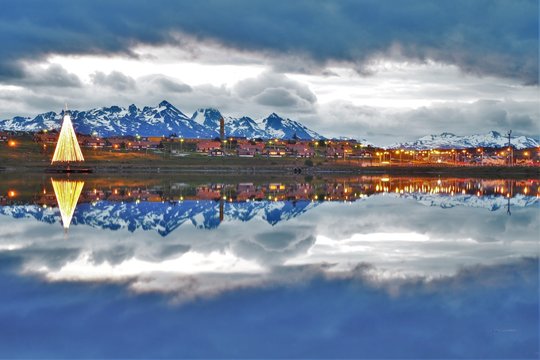 Middle-aged woman with curly hair holding argentine pesos outdoors by the seaside with a boat in the background, expressing emotion with hand on chest near a port.