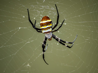 Silver argiope spider called an Argiope argentata is an orb weaver sitting in the middle of its web in Southern California