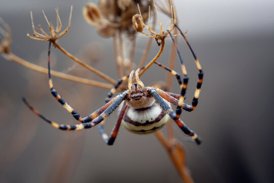 Closeup of exotic striped argiope bruennichi orb web spider sitting on cobweb against blurred background in daytime
