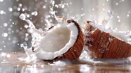 A halved coconut with fresh coconut water splashing out.  The image is lit by the sun.