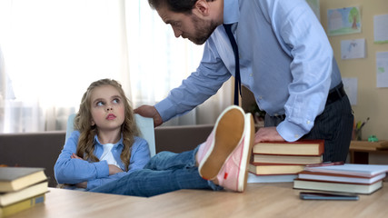 Mischievous daughter sitting with legs on table, ignoring fathers remarks