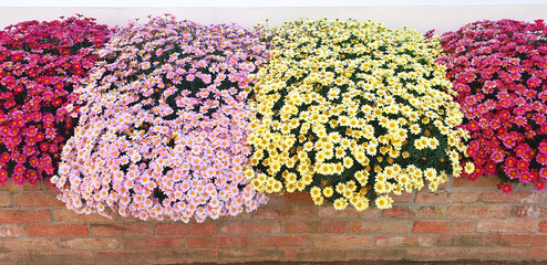 Bushes of colorful argyranthemum or anthemis flowers bloom in a flower bed. Panorama.