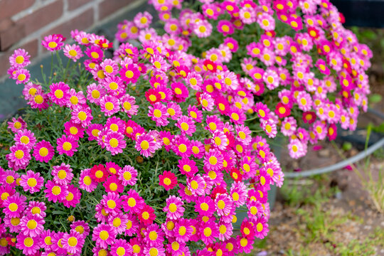 Selective focus of purple pink flowers with green leaves in garden, Argyranthemum frutescens known as Paris daisy or marguerite daisy, A perennial plant known for its flowers, Nature floral background