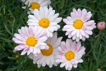 Delicate pink argyranthemum flowers highlighted by yellow centers, capturing garden elegance