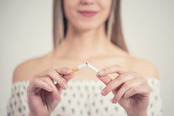 happy young beautiful woman holding a broken cigarette,quit smoking concept.