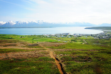 Arial shot of the city buildings and the river of the Hamaroy commune in Nordland Norway