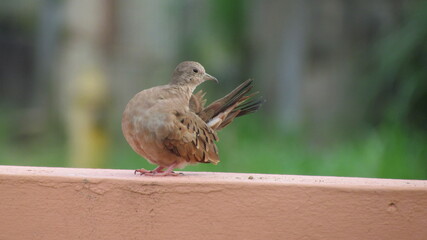 Female ruddy ground dove (Columbina talpacoti rufipennis) preening on a wall, Arima, Trinidad