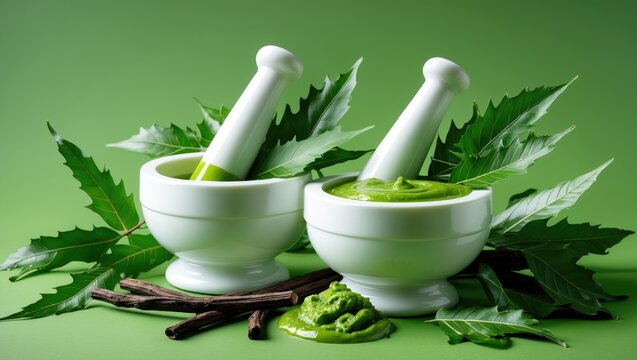 Medicinal Neem leaves in mortar and pestle accompanied by paste, juice, and twigs against a green backdrop.