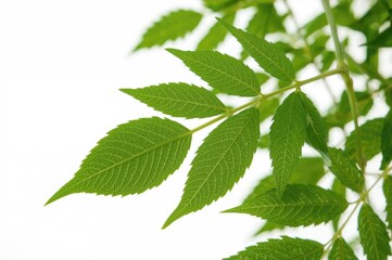 Isolated green leaves of a healing neem plant with textured surface on white background