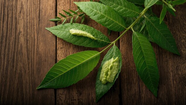 Medicinal Neem leaves with paste on a wooden surface, promoting herbal benefits
