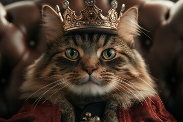 The regal and majestic feline monarch with a crown. Whiskers. And a furry vintage background illustration portrait of a royal cat in a fantasy domestic animal kingdom
