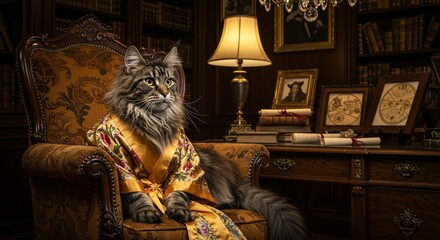 Majestic Maine Coon Cat in a Silk Robe Sitting in an Antique Chair in a Luxurious Library