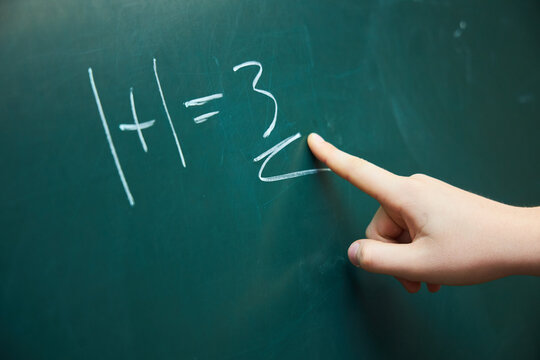 A teenager's hand shows an incorrectly solved example on a green blackboard. The concept of education and training.