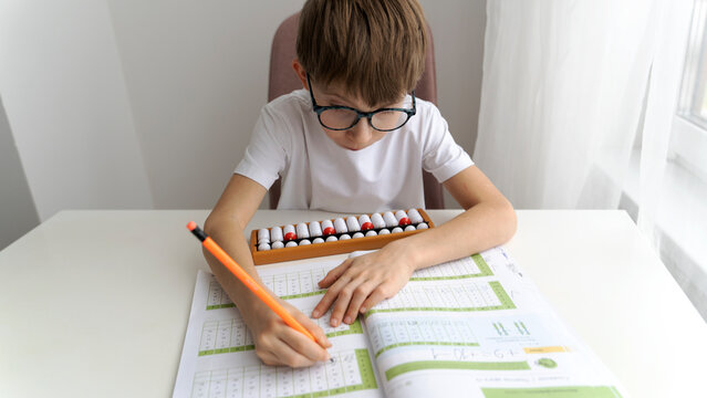 a boy doing abacus homework, education concept