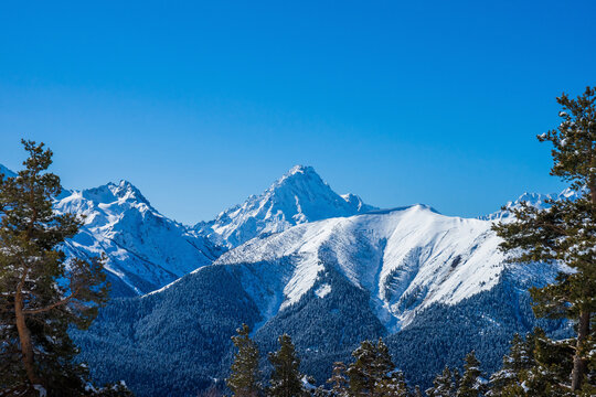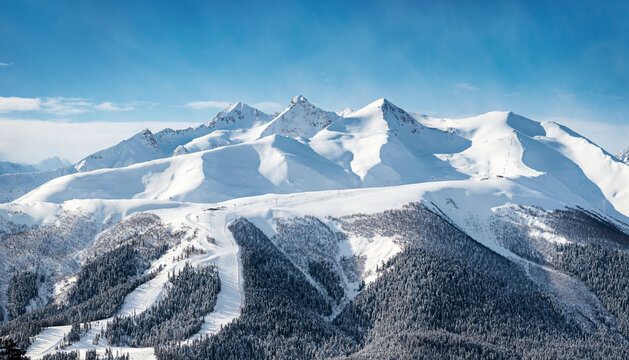 Snow covered Caucasus mountains in winter sunny day. View from ski slope. Arkhyz ski resort, Russia.