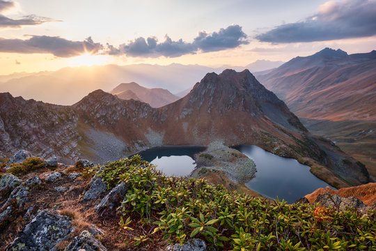 Beautiful mountains at sunset in clouds, gold alpine field, lakes and mountain ranges, travel and mountain life. Campground by the lake