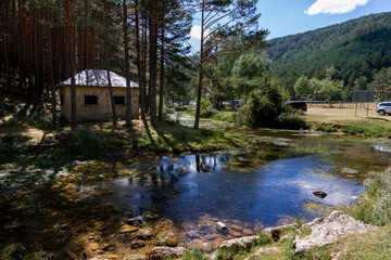 Source of the arlanza river with refuge and reflection in the river next to Quintanar de la Sierra in Burgos, Spain