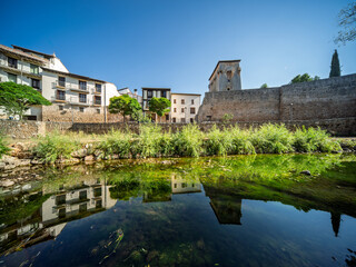 Reflections of covarrubias and fernán gonzález tower in arlanza river