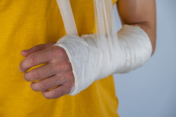 Close-up of a broken arm in a cast on  grey background.  Medicin