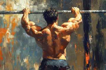 Weightlifter doing pull-ups on a sturdy bar, with muscles flexing and straining as they pull their chin above the bar with each repetition