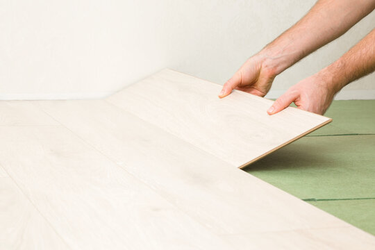 Young man hands laying light color laminate on green natural wood fiber insulation board. Flooring installation on fibreboard underlay. Repair work of home. Renovation process. Closeup. Side view.