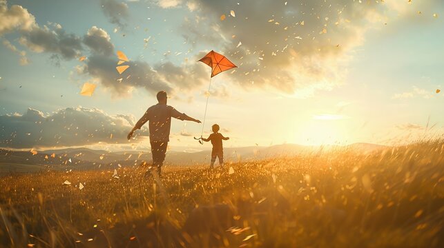 Child and father flying a kite, open field, backlit, high angle, vibrant, dynamic movement , stock photography style