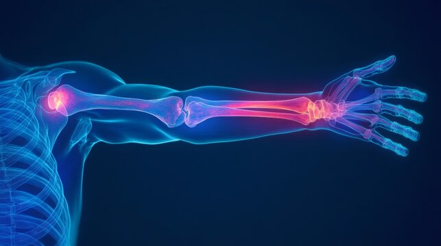A vivid representation of the human arm, showcasing the anatomical structure, joints, and bone connections, emphasizing the elbow and wrist areas, ideal for educational purposes in anatomy studies.