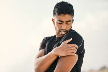 Sports man with elbow pain on arm, injury in outdoor soccer field. Hand massage bone, person with emergency muscle problem, physiotherapy in sport and joint accident with physical therapy