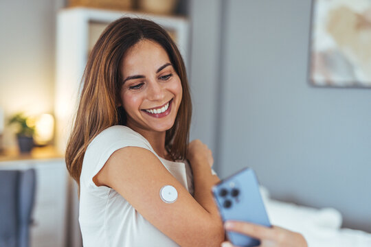 Smiling Woman Using Smartphone to Monitor Health with Sensor Patch