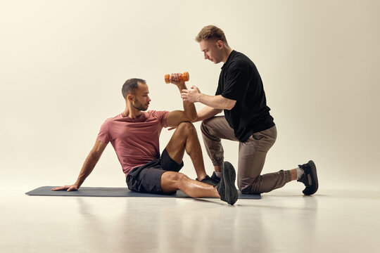 Trainer helping man perform seated dumbbell curl, guiding arm movement to ensure correct rehabilitation technique against studio background. Concept of rehabilitation, recovery, healthcare, sport