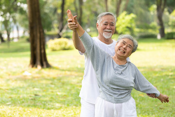 Active senior couple enjoying relaxing shoulder stretches outdoors