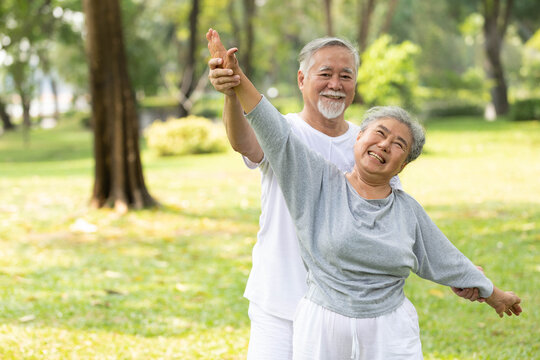 Asian duo stretching arms outdoors for balance and wellness in backyard garden practice