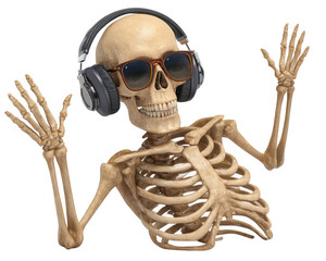 Skeleton with headphones sunglasses dancing joyful music fun quirky human bones isolated transparency background