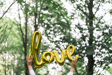 Close-up of woman holding the word love in a forest
