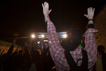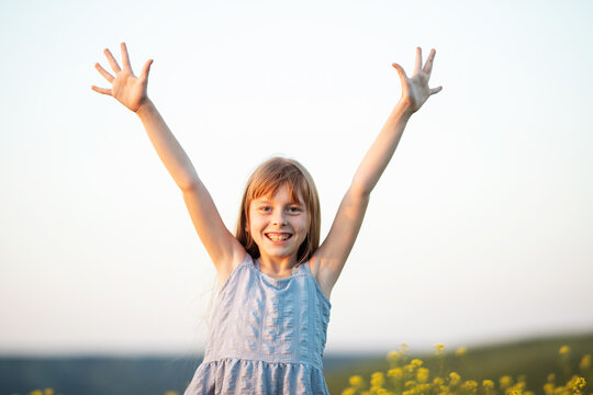 Happy young girl raises her fist up in delight! Successful victory gestures.