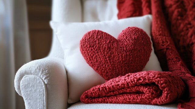 A white armchair featuring a small heart-shaped pillow and a folded red blanket