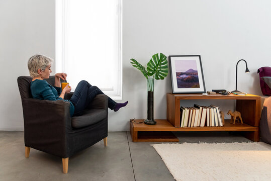 Senior woman relaxing in cozy armchair near window