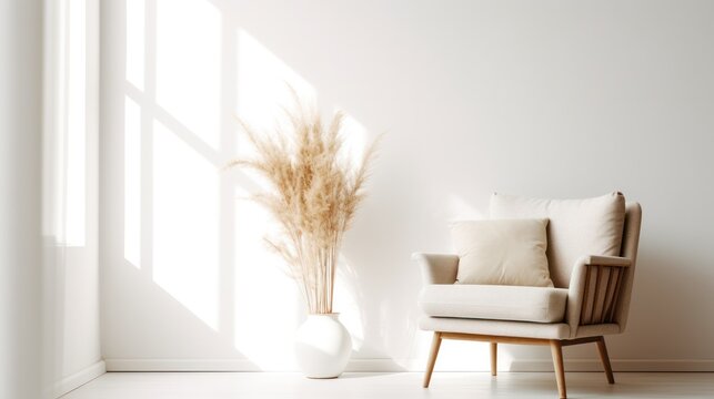 Modern armchair with wooden legs in a minimalist home office against a plain white wall and simple decor pieces.